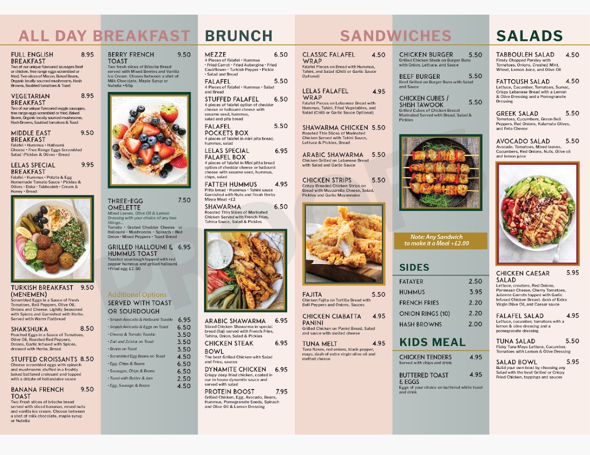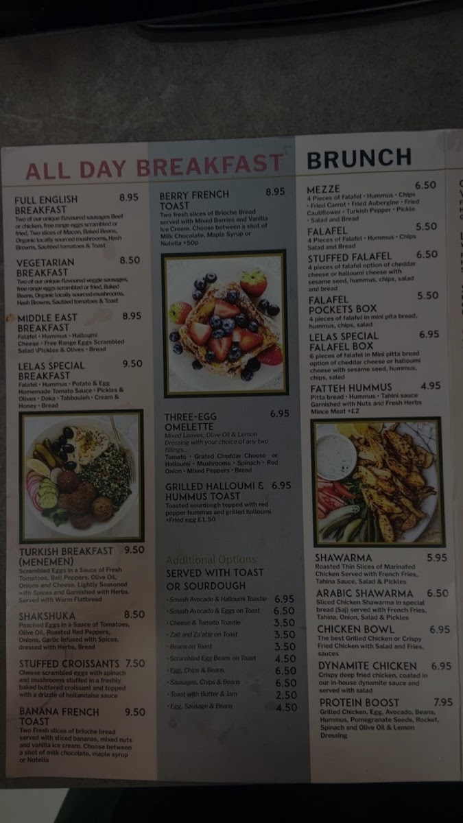 All Day Breakfast includes classic and international options such as Full English Breakfast, Vegetarian Breakfast, Middle East Breakfast, Lela’s Special Breakfast, and Berry French Toast. These items are designed to cater to different dietary preferences and include traditional and regional flavors.